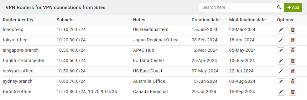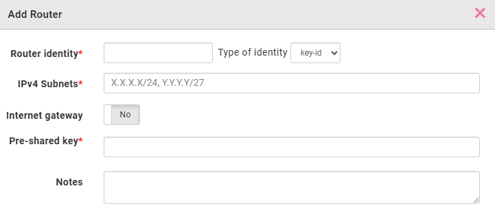 - IPv4 Subnets. Opsezite na privatna mrezha na vashata oddalechena lokacija. Vnesete edna ili povekje IP podmrezhi vo CIDR notacija, oddeleni so zapirki, na primer 192.168.1.0/24, 192.168.2.0/24. Ovie podmrezhi gi pretstavuvaat mrezhite zad vashiot ruter koi kje bidat dostapni preku VPN tunelot. Soobrakjajot namenet za ovie podmrezhi od drugi krajni tochki kje bide rutiran preku VPN gateway do ovaa lokacija.