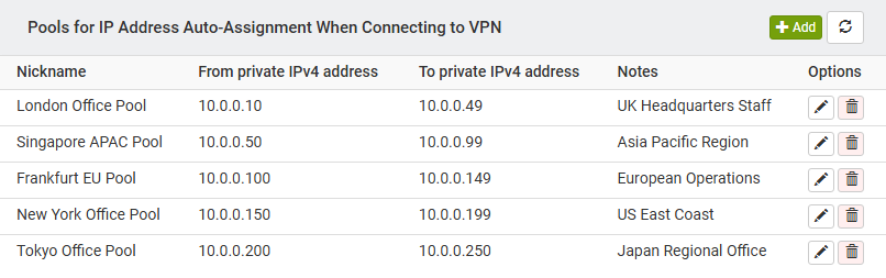 Dodadi vo sekcijata za IP pools. Vo konfiguraciskiot prozorec, vnesete prekar za identifikuvanje na opsegot i odredete ja prvata i poslednata IP adresa za opsegot. Osigurajte deka opsegot sodrzhi dovolno adresi za da gi smestite site korisnici koi mozhat istovremeno da se povrzat. Na primer, opseg od 10.0.0.100 do 10.0.0.150 obezbeduva 51 dostapna adresa za istovremeni VPN konekcii.